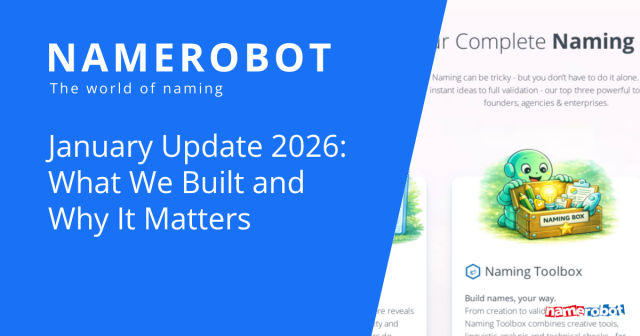 Produkt-Update von NameRobot für Januar 2026. Neugestaltung der Homepage, neue Branding-Inhalte, verbesserter NameScore und Fortschritte bei der Naming Toolbox für Gründer und Vermarkter.